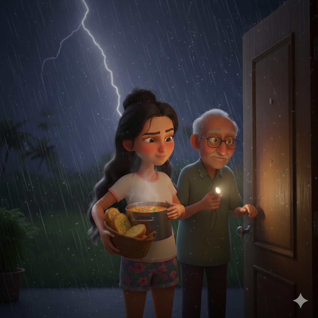 ஒரு மாலை, பலத்த மழையுடன் புயல் வீசியது. அப்போது அண்டை வீட்டில் வாழ்ந்த வயதான ராஜ் மாமா கவலையுடன் அழைத்தார். மின்சாரம் போய்விட்டது. அதனால் அவர் இரவு உணவை சூடாக்கவும் முடியவில்லை; தொலைபேசியையும் சார்ஜ் செய்ய முடியவில்லை. மீராவின் அம்மா அவசர வேலை காரணமாக மருத்துவமனையிலேயே இருந்தார்.