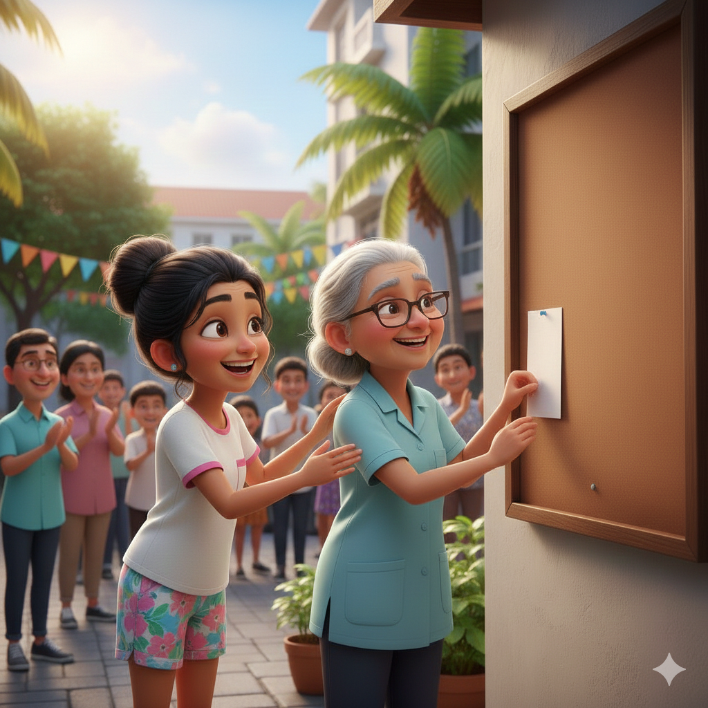 Neighbors cheered Meera as the star helper. Uncle Raj shared her story on the community board.