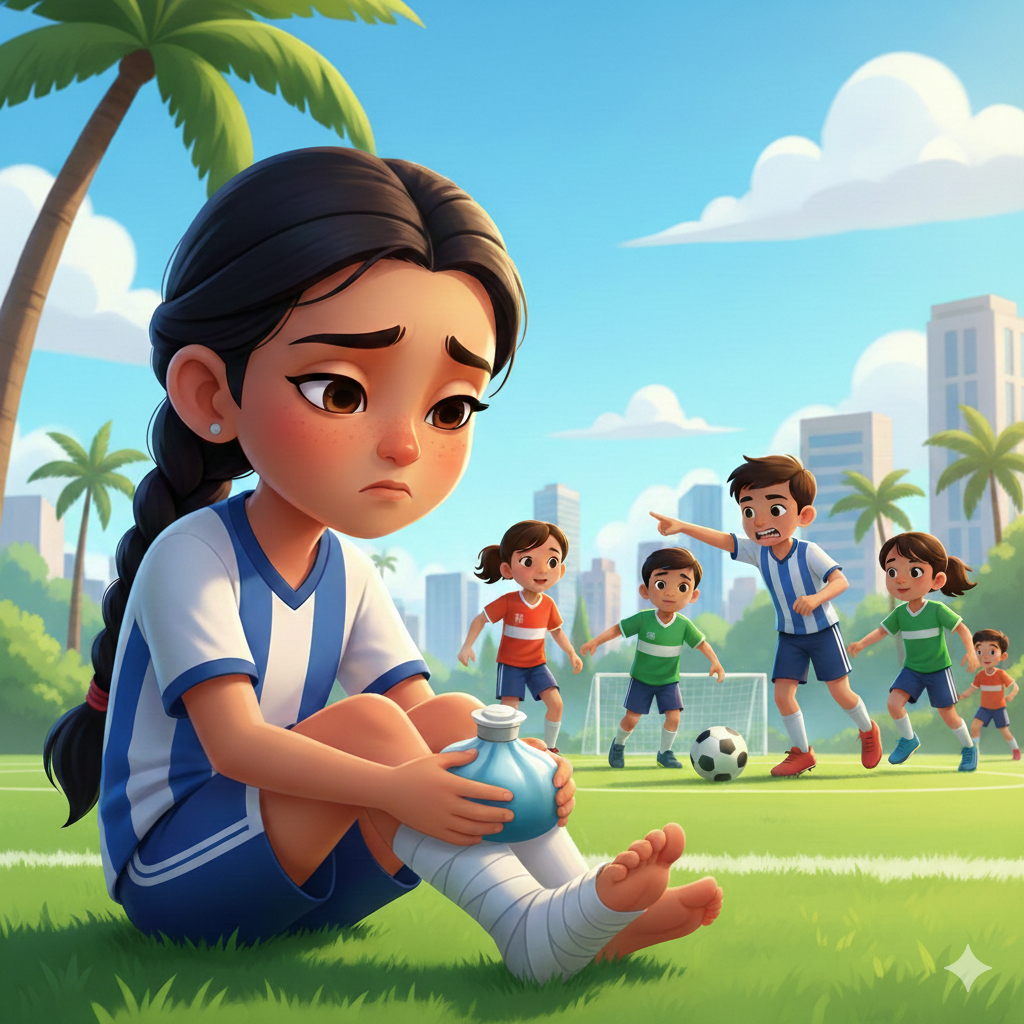 Sanjana stumbled, sprained her ankle, and ended up sitting on the sidelines. As she watched the others play, she felt small and worthless.